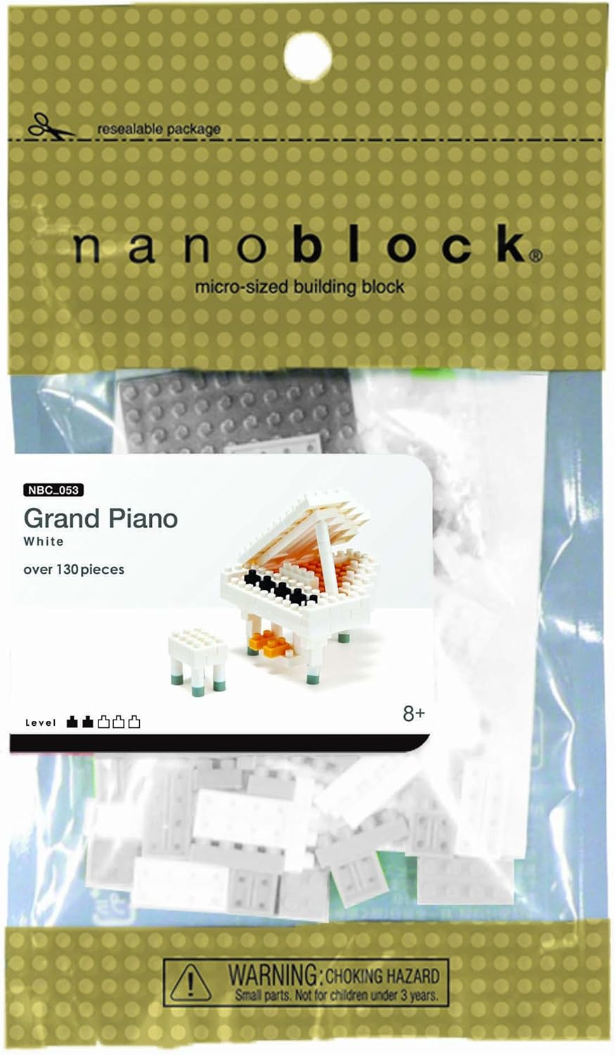 Image: Front of the Nanoblock Grand Piano packaging, displaying the product name, piece count (over 130 pieces), and recommended age (8+). The packaging also shows a small image of the assembled white grand piano and stool.