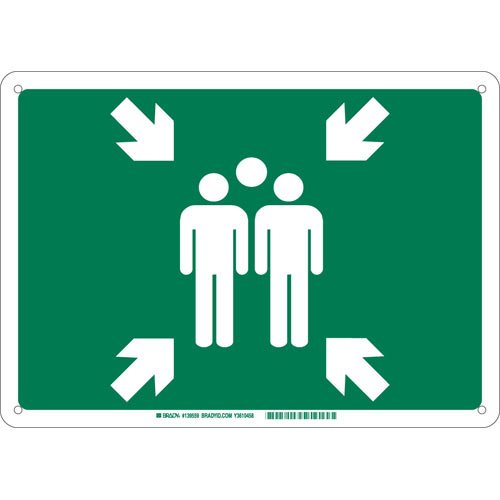 Image: The Brady 139559 Fiberglass "Assembly Point" Sign, featuring a green background with white graphics of two human figures and four arrows pointing inwards, signifying a designated gathering area.