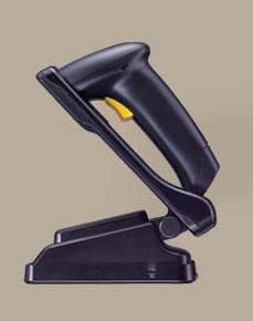 Figura 2.1: CipherLab 1500P HP barcode scanner placed in its autosense stand. The scanner is black with a yellow trigger button, and the stand is also black, providing a stable base for the scanner.