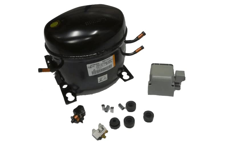 Figura 1: Whirlpool EGAS80HLR Refrigerator Compressor. This image displays the main compressor unit along with various associated components such as starting relays, overload protectors, and mounting grommets, which are typically included for installation.