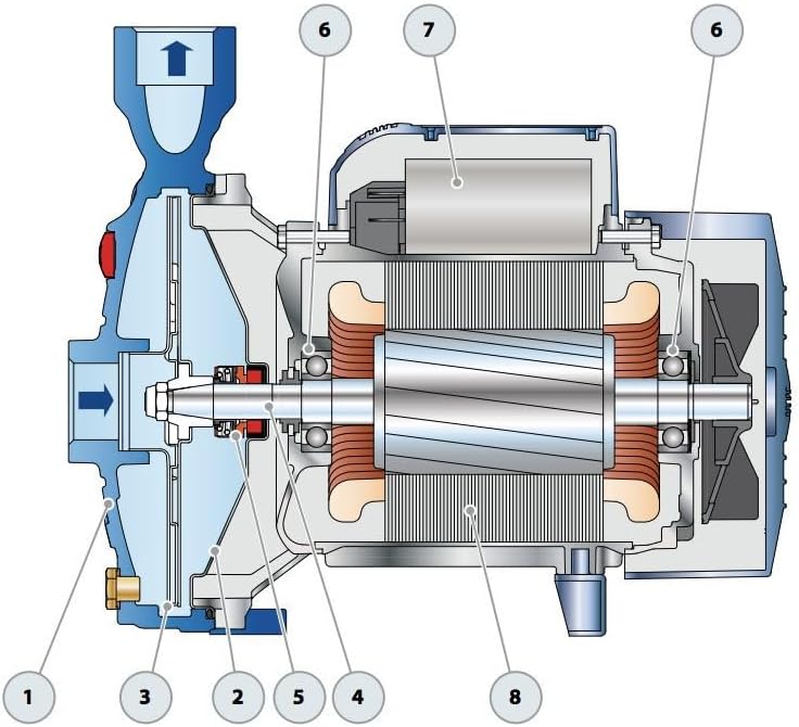 Figura 1: Sploda view of the Pedrollo CPM150 pump, showing internal components. Key parts include (1) Pump Body, (2) Impeller, (3) Mechanical Seal, (4) Motor Shaft, (5) Bearings, (6) Motor Casing, (7) Capacitor (for single-phase), and (8) Stator/Rotor Assembly.