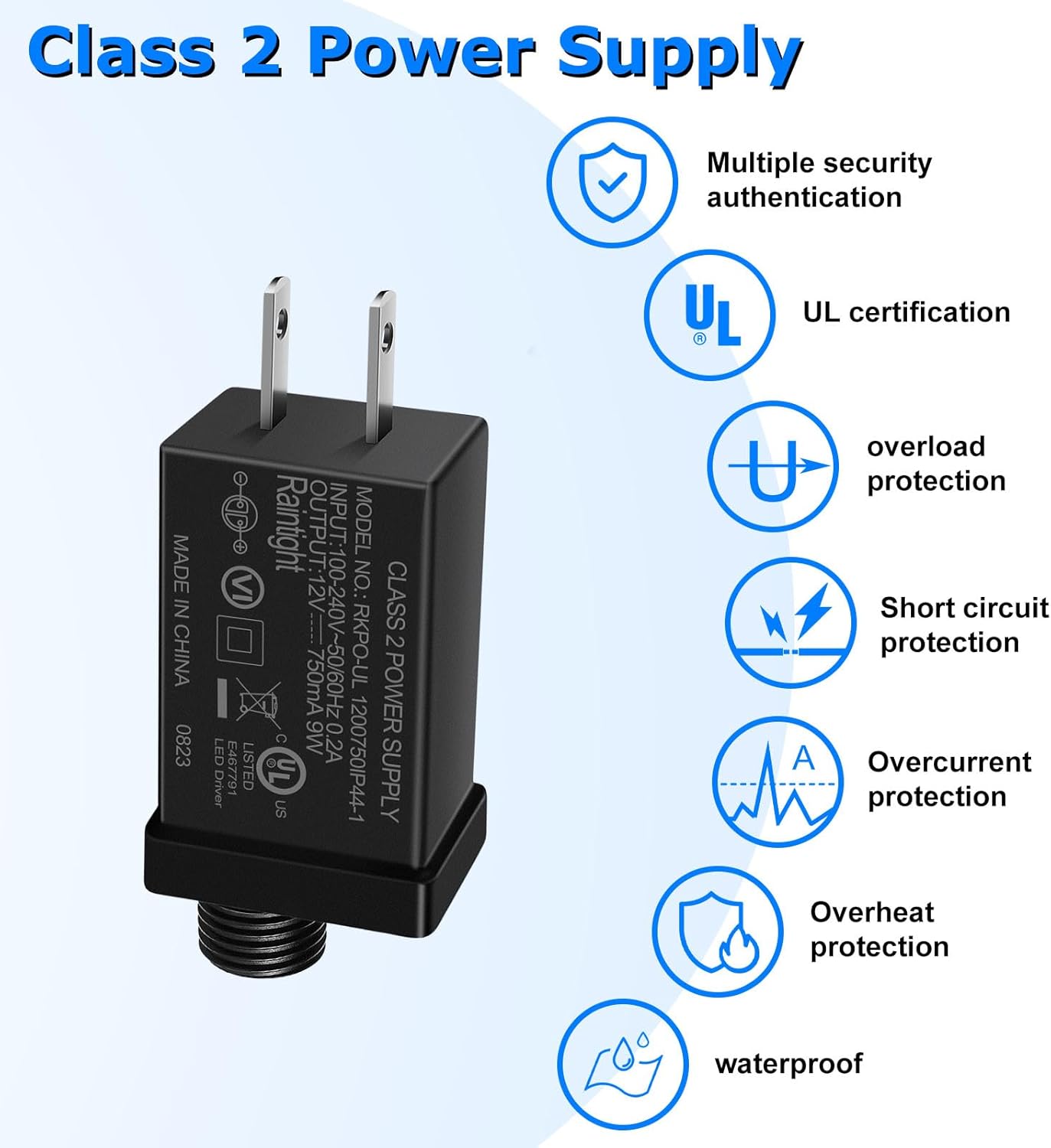 Image: The power supply unit displaying various safety certifications and protection features, including UL certification, overload, short circuit, overcurrent, overheat protection, and waterproof rating.