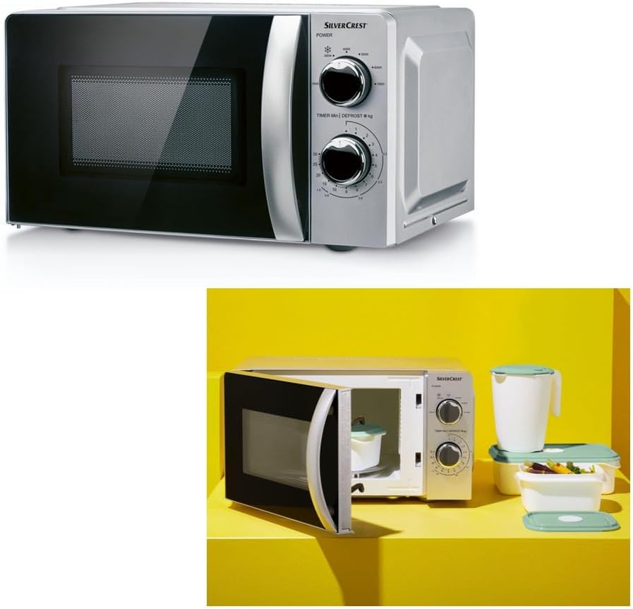The Silvercrest SMW 700 D3 is a compact and efficient microwave oven designed for heating and defrosting various food items. It features intuitive rotary knobs for power level and time settings, a 17-liter capacity, and a glass turntable for even cooking.