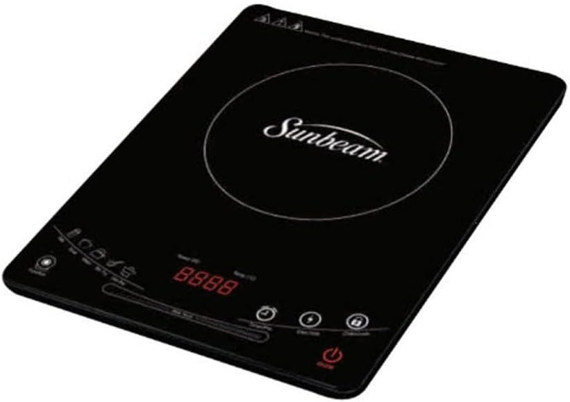 Image: The Sunbeam SIC-31A Single Plate Induction Cooker, showcasing its black crystal plate, touch control panel, and digital display. The Sunbeam logo is visible in the center of the cooking zone.