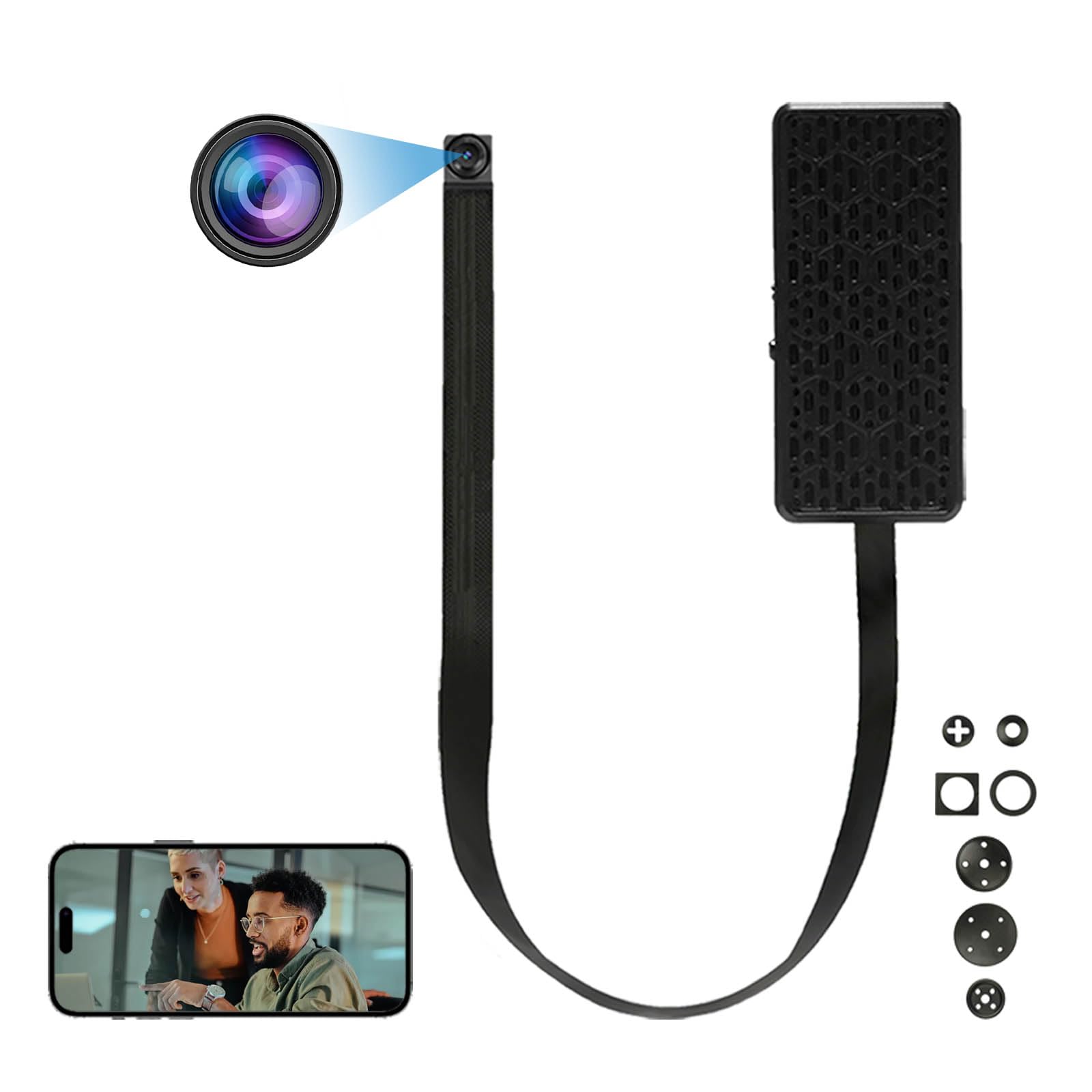 The mini lens design allows for integration into various objects for discreet placement. Ensure the lens has an unobstructed view of the area you wish to monitor. Common placements include toys, bags, flower pots, or photo frames.