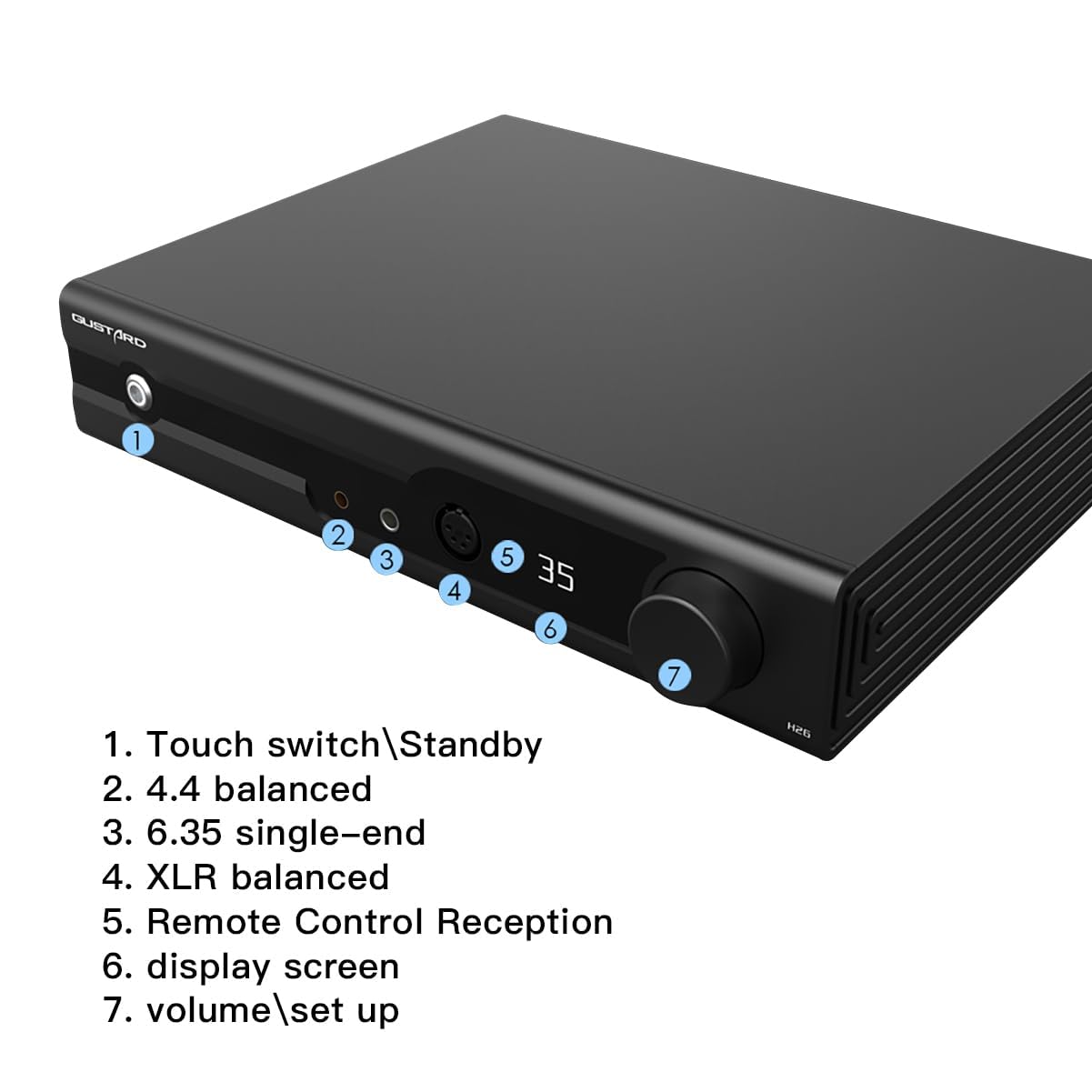 The Gustard H26 is a high-performance, fully balanced discrete Class A headphone amplifier designed to deliver exceptional audio fidelity. It incorporates advanced features and robust construction to provide a superior listening experience for audiophiles.