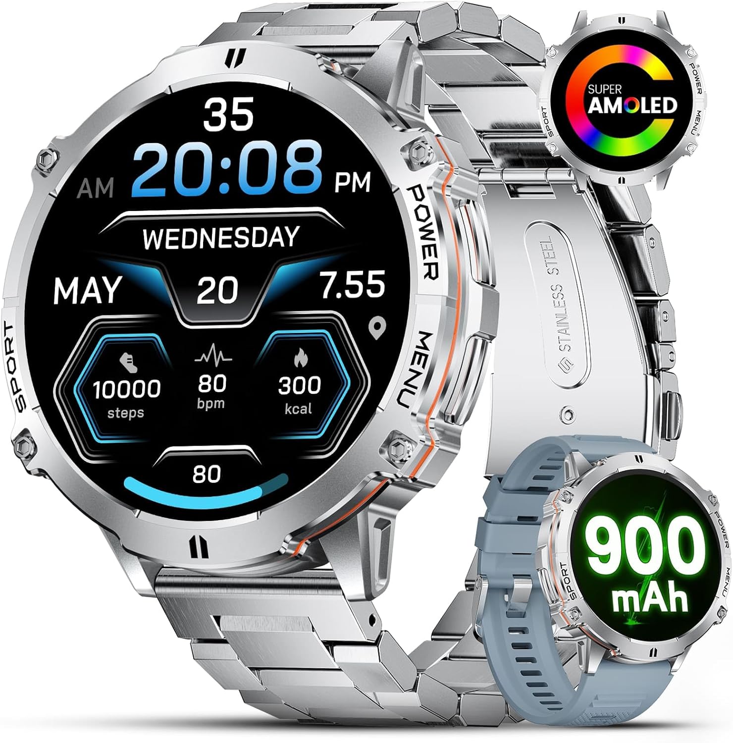 Image: The SUNKTA Smart Watch TX3-B with its main display showing various metrics and a secondary image highlighting its AMOLED screen and 900mAh battery.